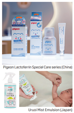 In 2024, we launched the Pigeon Lactoferrin Special Care series in China, featuring lactoferrin—a nutrient found in breast milk and formula—as the main ingredient. Lactoferrin has been found to improve the skinʼs barrier function at certain concentrations, suppress inflammatory factor secretion, reduce irritation, and moisturize baby skin.