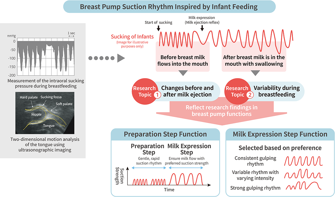 To identify the mechanism of the sucking motion by infants, Pigeon studied the natural feeding behavior of infants using devices to measure intraoral sucking pressure and used ultrasonography (echography) to observe the oral movements of infants. Findings from these research studies have been used in the development of the suction rhythm of breast pumps. The research results are reflected in breast pumps through Pigeon's approach of researching both perspectives of breastfeeding by the mother and sucking by the infant as shown below.