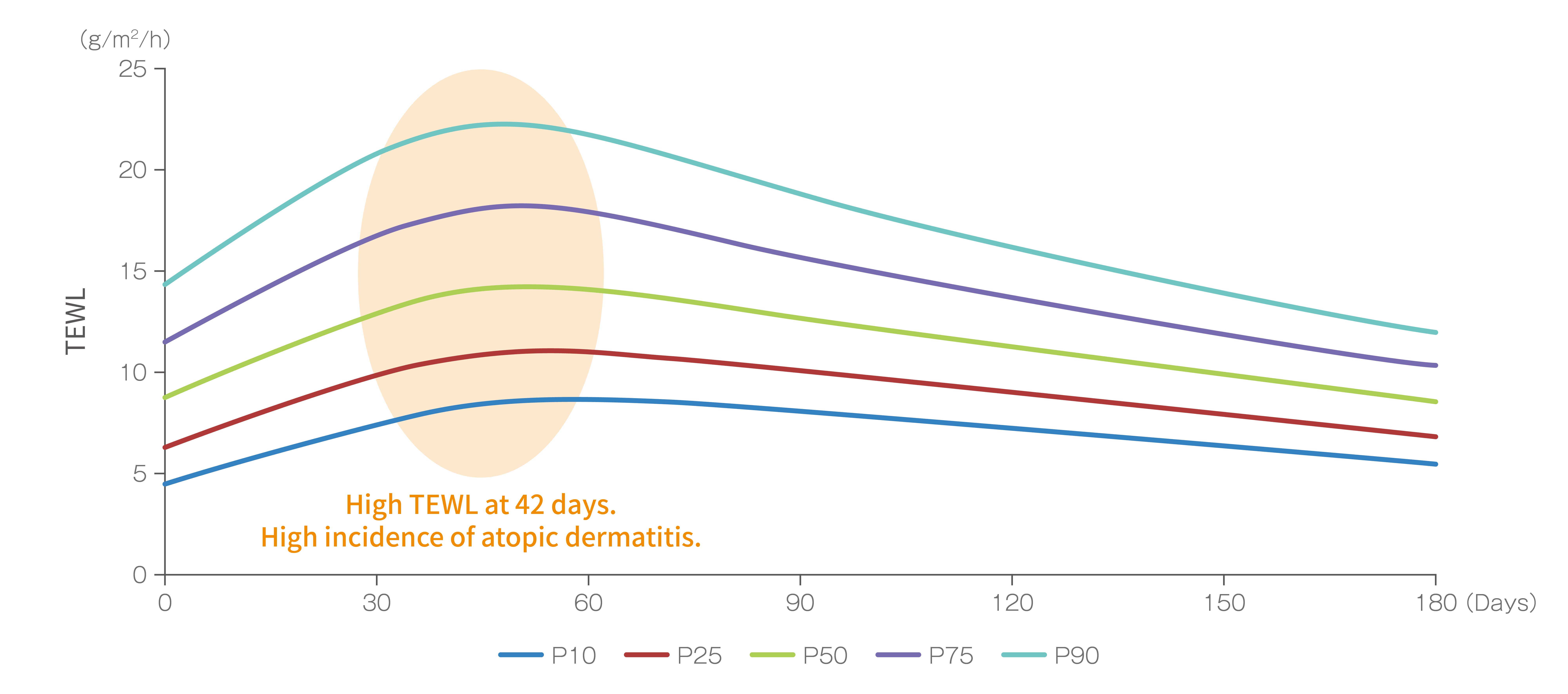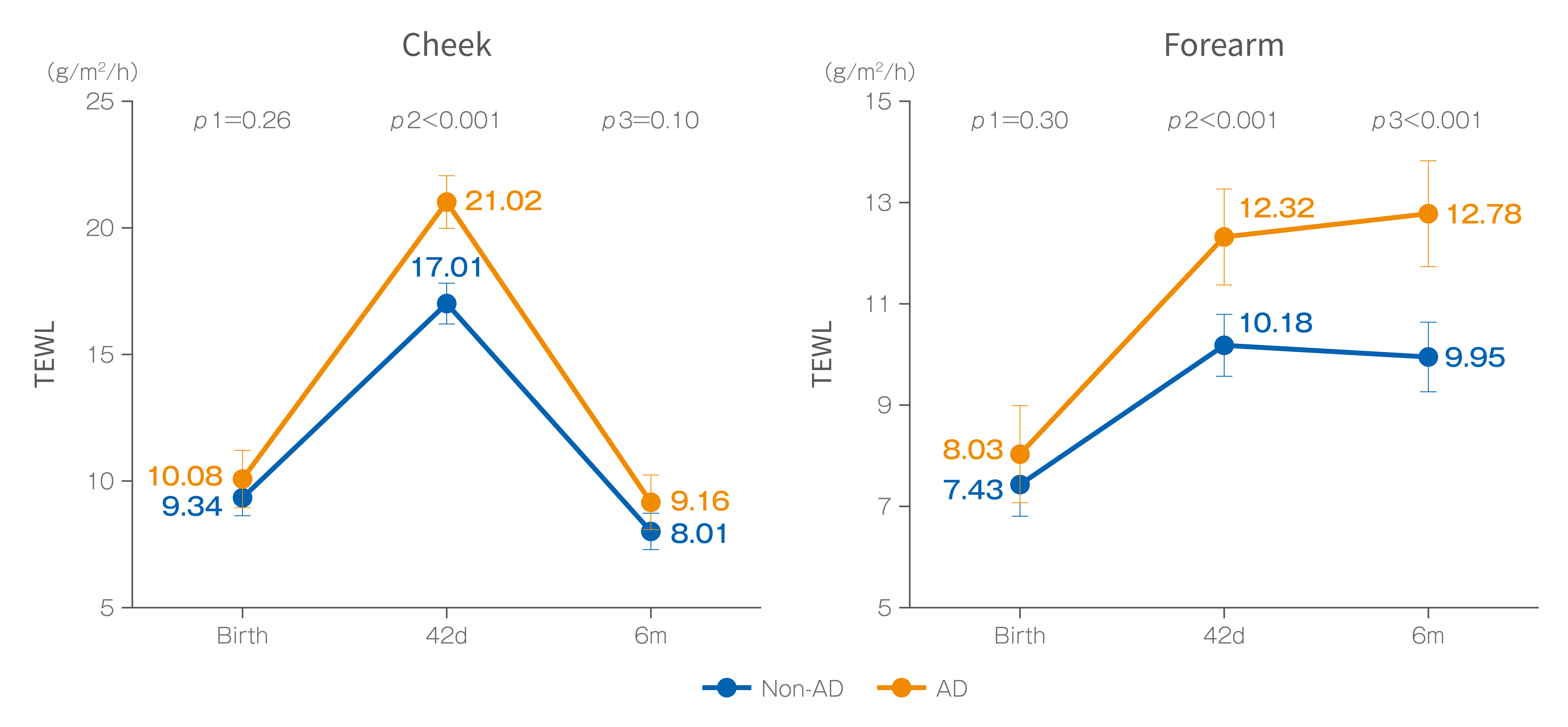 These findings suggest that the first 42 days from birth represent a critical period, and monitoring cheek TEWL can enable early identification of high-risk infants. Furthermore, early moisturizing care for infants with higher TEWL values may help to restore the skin barrier function and potentially suppress the onset of AD.