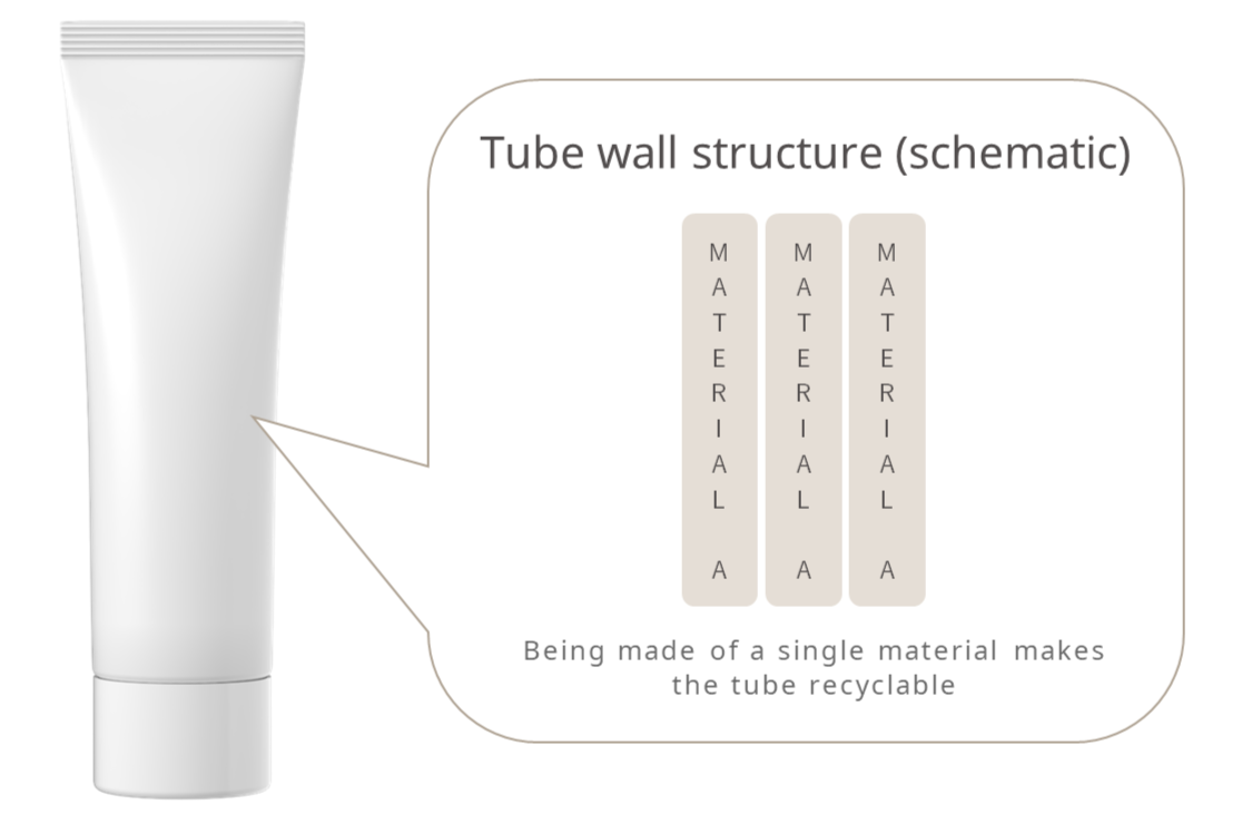 In the past, our skincare product packaging has generally had walls with a multilayered structure, in which a layer of material serving as a barrier is sandwiched between layers of plastic. This helped to preserve the quality of products such as creams meant for use on babies’ skin, but the multilayered structure meant that the packaging couldn’t be broken down into separate materials, making it difficult to recycle.