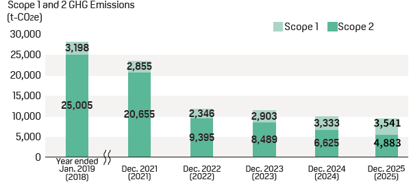 Our GHG emissions across the entire group in FY2025 were 3,541 t-CO2e for Scope 1 and 4,883 t-CO2e for Scope 2 (total: 8,424 t-CO2e). As a result of GHG reduction activities such as the introduction of on-site power generation using solar panels, purchase of Renewable Energy Certificates and energy saving activities, our scope 1&2 emissions decreased by 1,534 t-CO2e (70%) compared to FY2018.